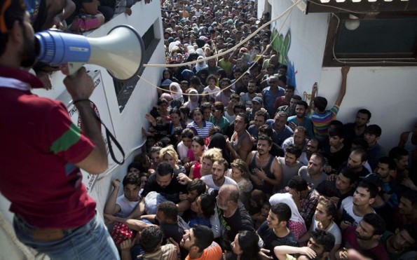 Πρόσφυγες συνωστίζονται έξω από το στάδιο της Κω όπου λαμβάνει χώρα η διαδικασία καταγραφής τους.